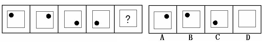 (答案:B。黑點(diǎn)在正方形中順時針移動。在第5個圖形中,應(yīng)該正好移動到左上角。)